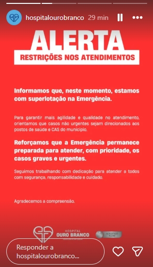 Veja o comunicado publicado nos stories do Hospital Ouro Branco: