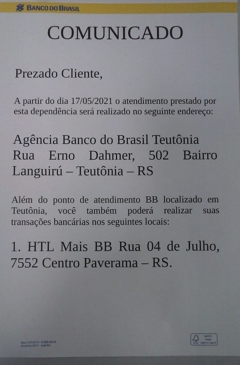 Dentro da agencia existem comunicados informando que os serviços prestados na unidade de Paverama podem ser realizados no Banco do Brasil de Teutônia, na Rua Erno Dahmer, n° 502, no Bairro Languiru.