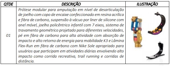 Atualmente está com uma prótese que já não lhe atende mais, com folga no joelho e o pé rachado, o que logo vai inviabilizar o uso. Além disso, ela quer muito iniciar uma vida de atleta, e para isso, precisa de uma prótese que lhe dê maior mobilidade.