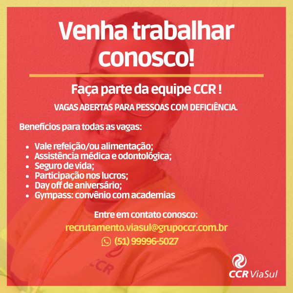 Para quem preferir, há também a opção de enviar o currículo via WhatsApp pelo número (51) 99996-5027 ou através do email recrutamento.viasul@grupoccr.com.br.