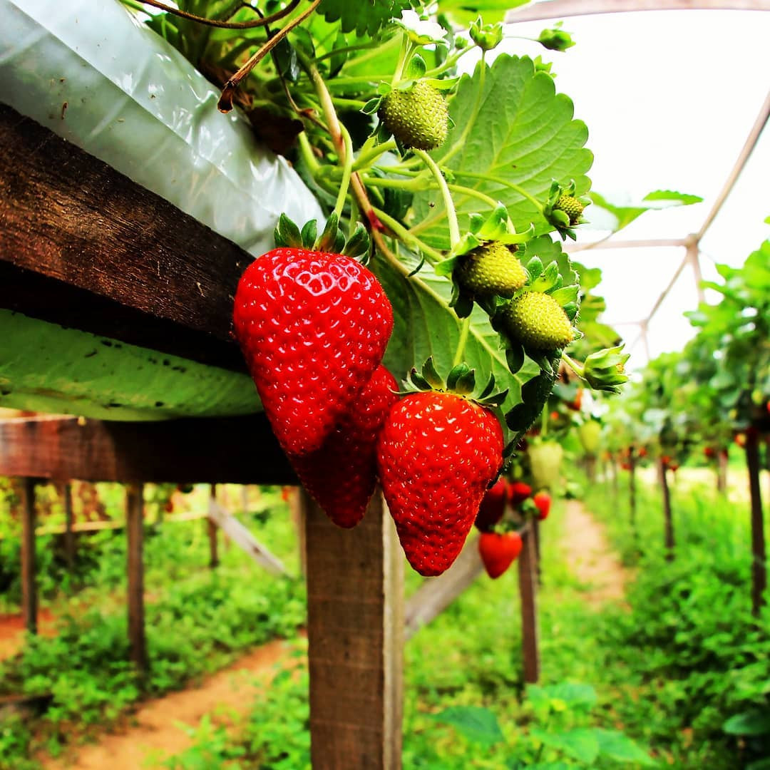 Segundo Marcelo Fernando de Oliveira, a produção começou em 2018, a partir da chegada das mudas de morangos da província de Segóvia, na Espanha. Desenvolvidos num sistema semi-hidropônico sob um ambiente protegido por uma estufa construída ainda em 2017, a irrigação ocorre através de mangueira gotejadora. Na prática, a aplicação acontece por bombeamento conforme necessidade das plantas.