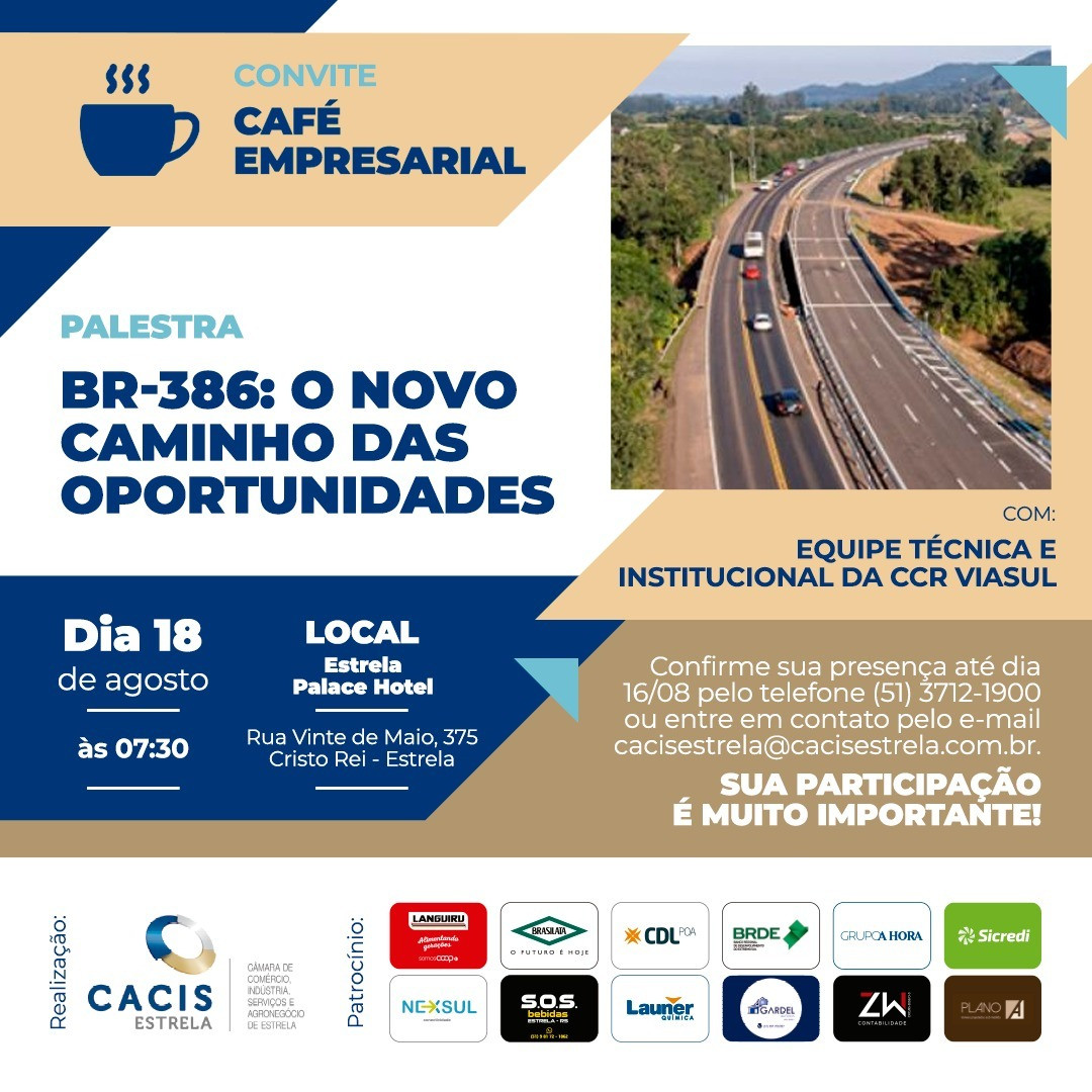A Câmara de Comércio, Indústria, Serviços e Agronegócio (Cacis) de Estrela realiza, quinta-feira, dia 18 de agosto, mais uma edição do Café Empresarial, tradicional evento da entidade que traz informações de interesse dos associados e demais interessados. Na oportunidade, a equipe técnica e institucional da CCR ViaSul abordará o tema "BR-386: o novo caminho das oportunidades".