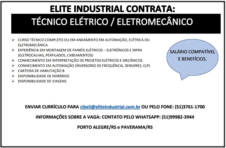 A Elite esta com vaga para contratação imediata para Técnico Elétrico/Eletromecânico.