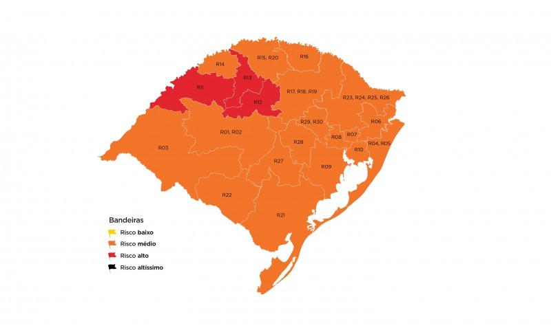 As regiões de Cruz Alta, Ijuí e Santo Ângelo – todas da macrorregião Missioneira, que estavam na bandeira laranja –, também apresentaram piora nos indicadores e voltaram para a bandeira vermelha. As outras 15 regiões seguem em bandeira laranja.