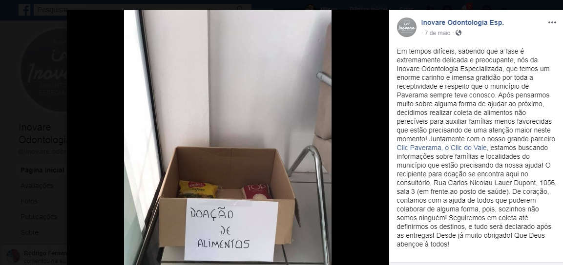 A Inovare Odontologia Especializada está organizando uma campanha de arrecadação de alimentos. O objetivo é auxiliar as famílias mais necessitadas do município nesse período de pandemia.