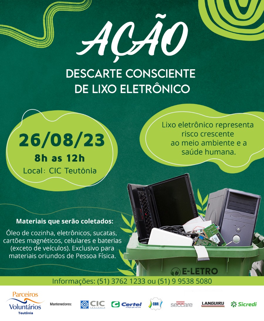 No próximo sábado, dia 26, das 8h às 12h, ocorre mais uma edição de descarte consciente de lixo eletrônico, iniciativa que integra a ação socioambiental teutoniense Revive Boa Vista. O posto de coleta estará localizado junto à CIC Teutônia, no Centro Administrativo Municipal.