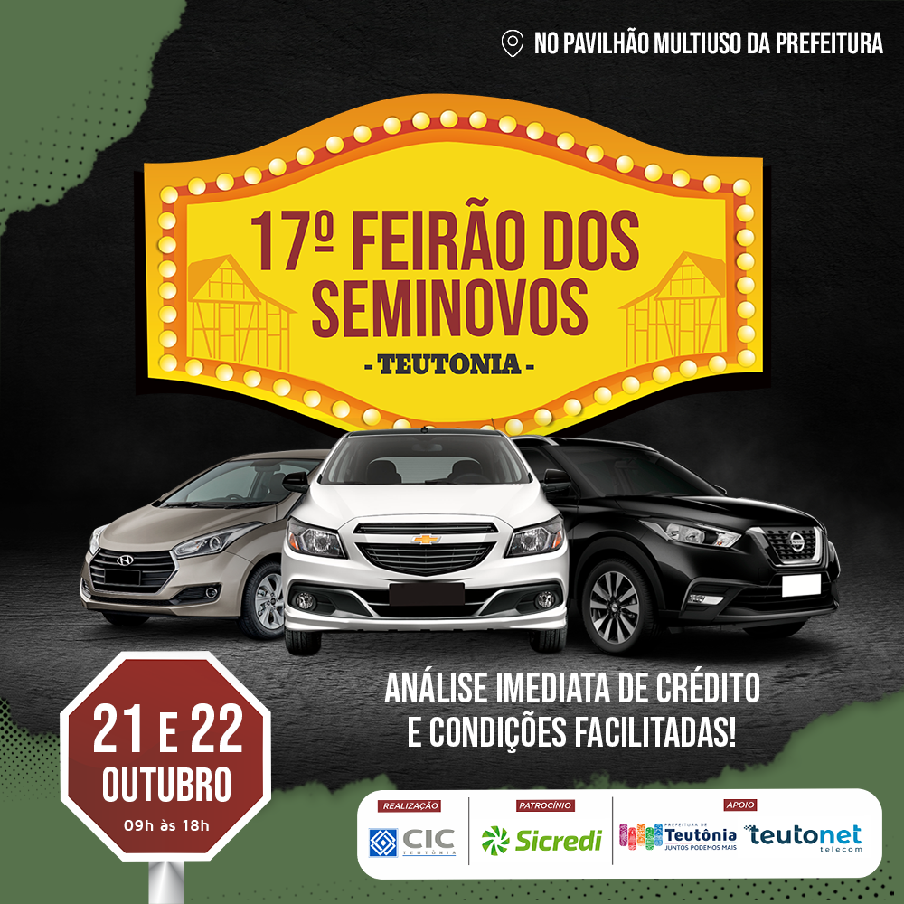 No sábado e domingo, dias 21 e 22 de outubro, das 9h às 18h, ocorre o 17º Feirão de Veículos Seminovos de Teutônia, realização da CIC Teutônia e revendas locais, com o patrocínio de Sicredi, apoio da Administração Municipal e Teutonet Telecom.