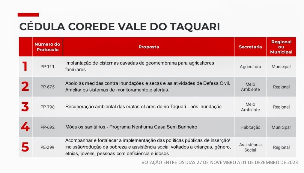 A votação da Consulta Popular 2023, ferramenta democrática e participativa que define as prioridades regionais que vão ser incorporadas ao Orçamento do Estado em 2024, iniciou segunda-feira, 27 de novembro. Cidadãos de todo o Rio Grande do Sul poderão votar nas ações que consideram essenciais para sua região ou município até 1º de dezembro.
