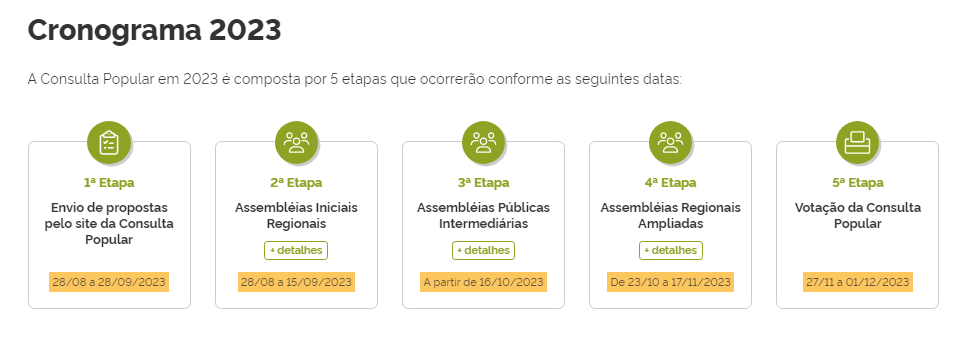 Para participar da votação, basta que o cidadão acesse o portal da Consulta Popular com o título de eleitor e escolha a ação que deseja ver implementada. No passo seguinte, o votante será encaminhado para a cédula de votação regional, que contém entre cinco e dez ações definidas a partir do Caderno de Demandas Elegíveis pelas assembleias regionais.