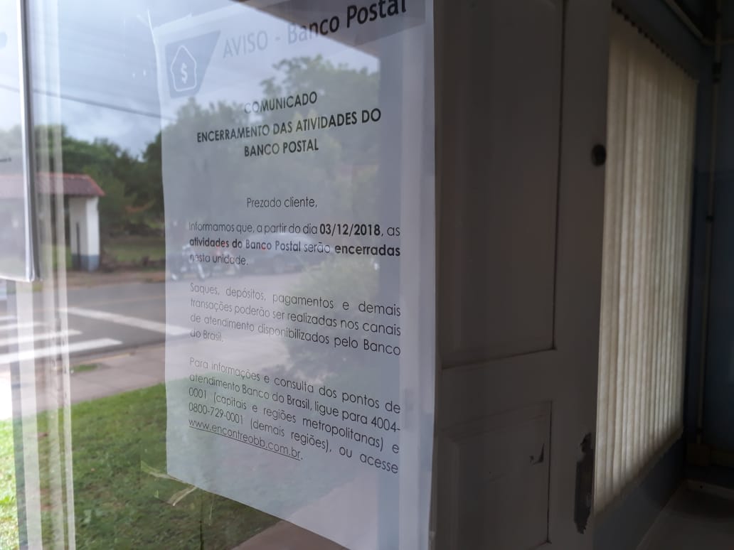 Os clientes que irem até a agência dos Correios em Paverama, no Bairro Centro, se depararão com um cartaz colado na porta de entrada, informando que a partir do dia 3 de dezembro os serviços do Banco Postal serão encerrados nesta agência.
