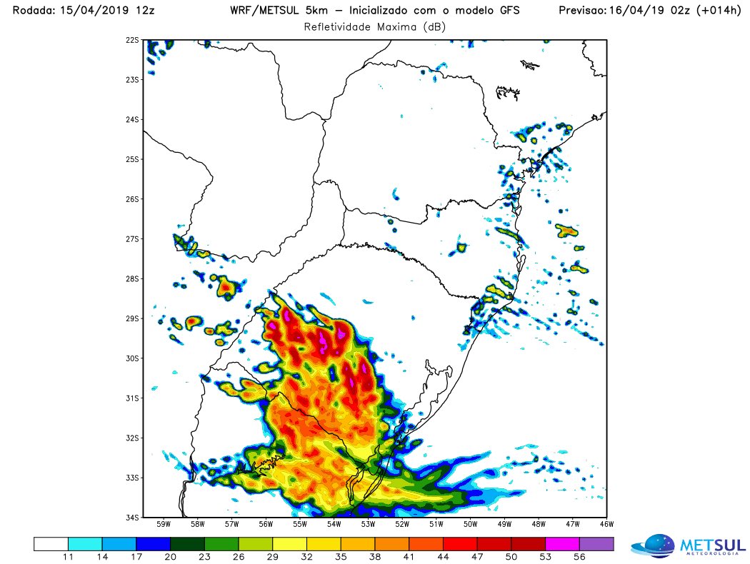 Já a MetSul Meteorologia divulgou mapa com o avanço das células de chuva sobre o Estando, destacando que existem condições de risco de chuva localmente forte e temporais isolados de vento e granizo nesta noite no Oeste, Centro e o Sul gaúcho. Entre a madrugada e de manhã nas demais regiões.