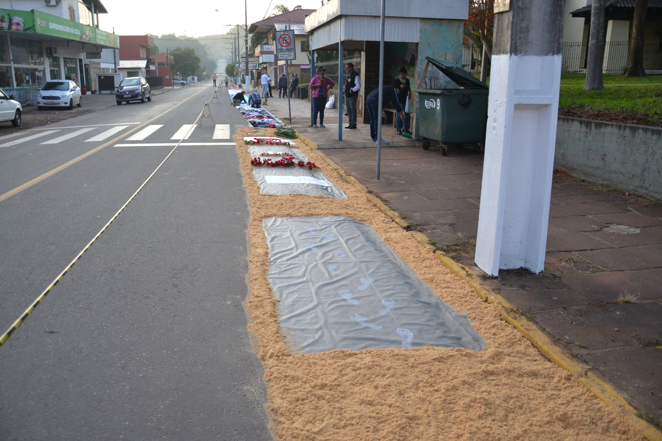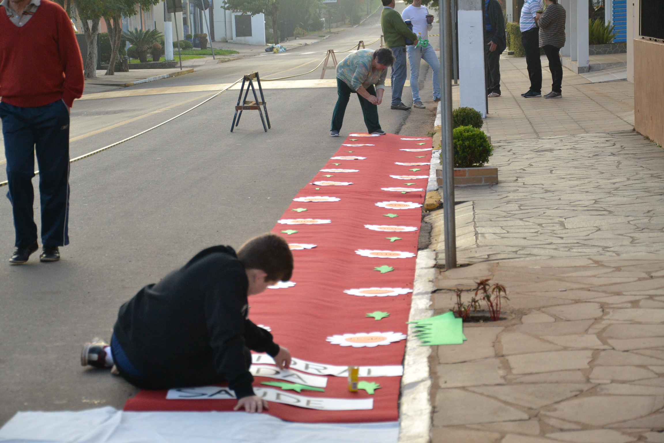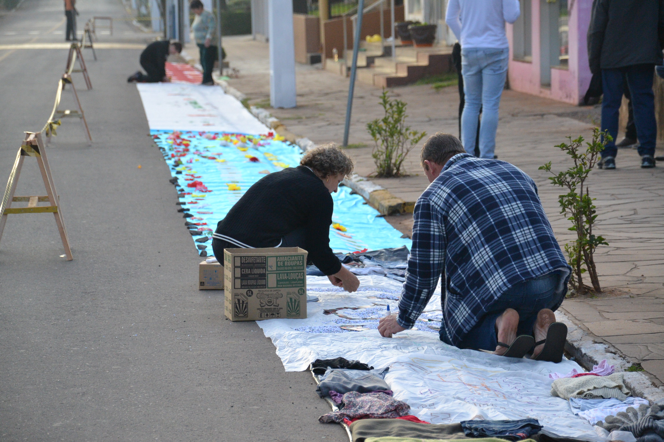 Católicos de Paverama levantaram cedo nesta quinta-feira, dia 31, de feriado para confeccionar os tradicionais tapetes de Corpus Christi. A tradição da Igreja Católica é mantida em todo o país e este ano reuniu um número ainda maior de pessoas no município.