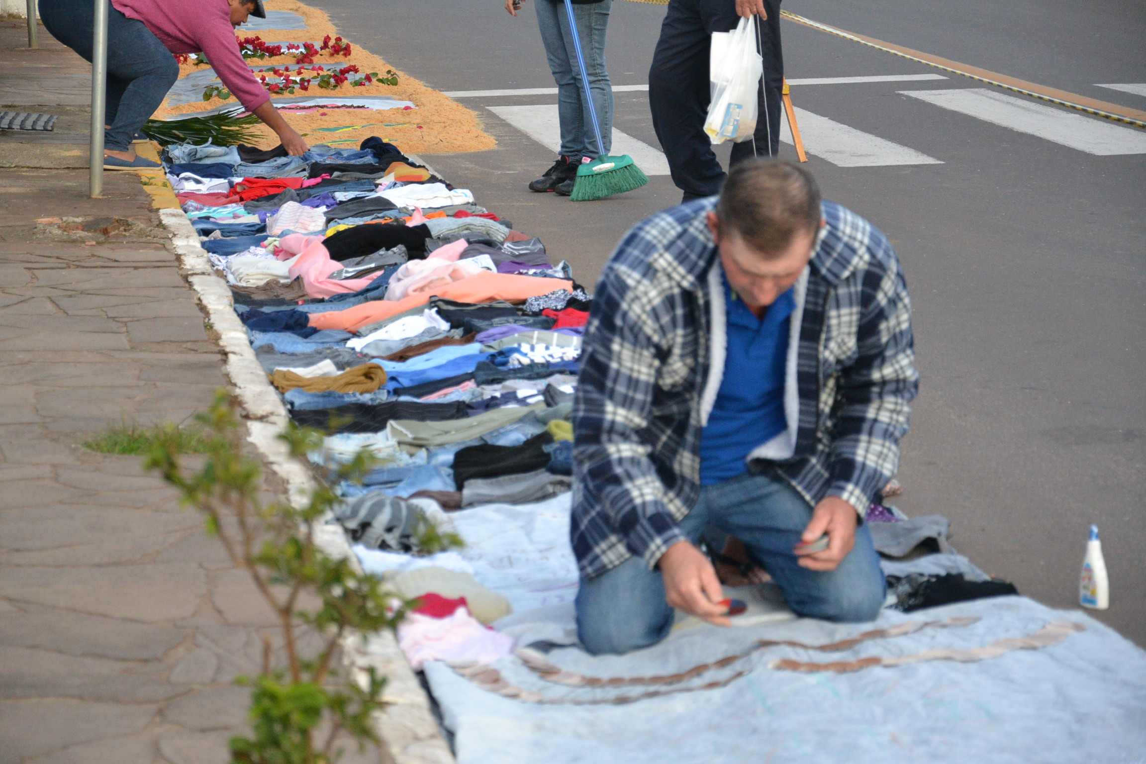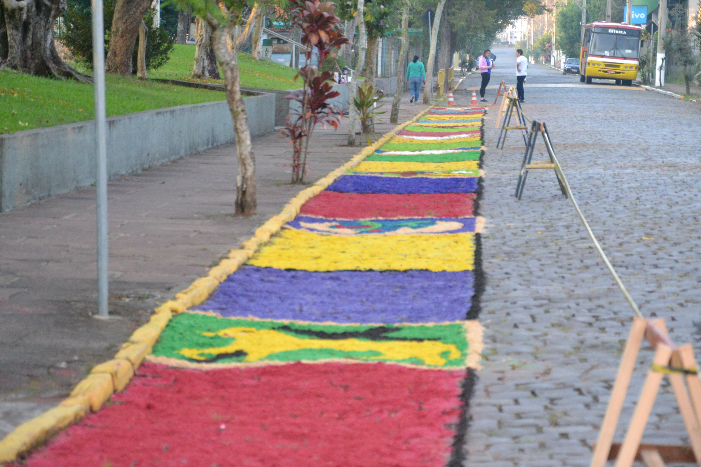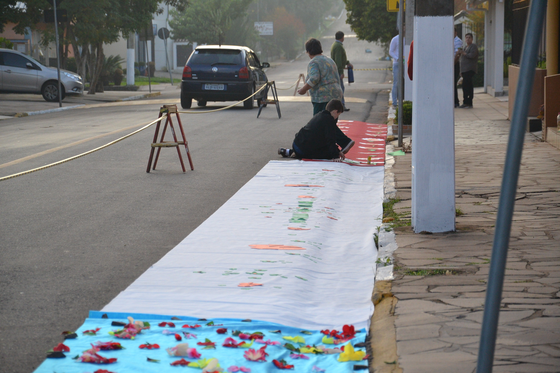 Católicos de Paverama levantaram cedo nesta quinta-feira, dia 31, de feriado para confeccionar os tradicionais tapetes de Corpus Christi. A tradição da Igreja Católica é mantida em todo o país e este ano reuniu um número ainda maior de pessoas no município.