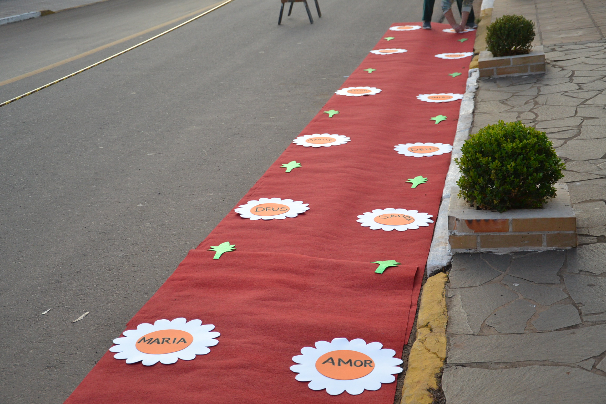 Foram utilizados serragem, materiais recicláveis e até mesmo roupas, que serão usadas para doação, para confeccionar os tapetes. Símbolos da Eucaristia, mensagens de amor e paz compunham o tapete que mais parecia uma grande obra de arte. O trabalho começou na Rua Emiliano Dias Siqueira em frente a Praça da Matriz e terminou em frente a Agrocomercial Althaus, na Rua 4 de Julho.