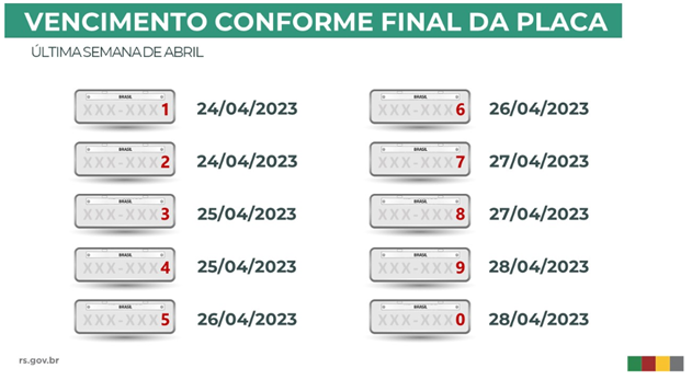 O vencimento dos números seguintes ocorre ao longo da semana, conforme tabela abaixo, encerrando-se na sexta-feira, dia 28, dia em que vencem as placas de final “9” e “0”.