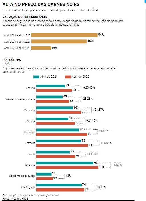 Alguns cortes chegam a ter elevação na casa dos 23%. O levantamento mostra a variação de valores entre abril deste ano e o mesmo mês de 2021. A pesquisa coleta preços de Porto Alegre, Região Metropolitana e dos principais centros consumidores do Estado. Aumento nos custos de produção é um dos principais motivos desse movimento, conforme especialistas.