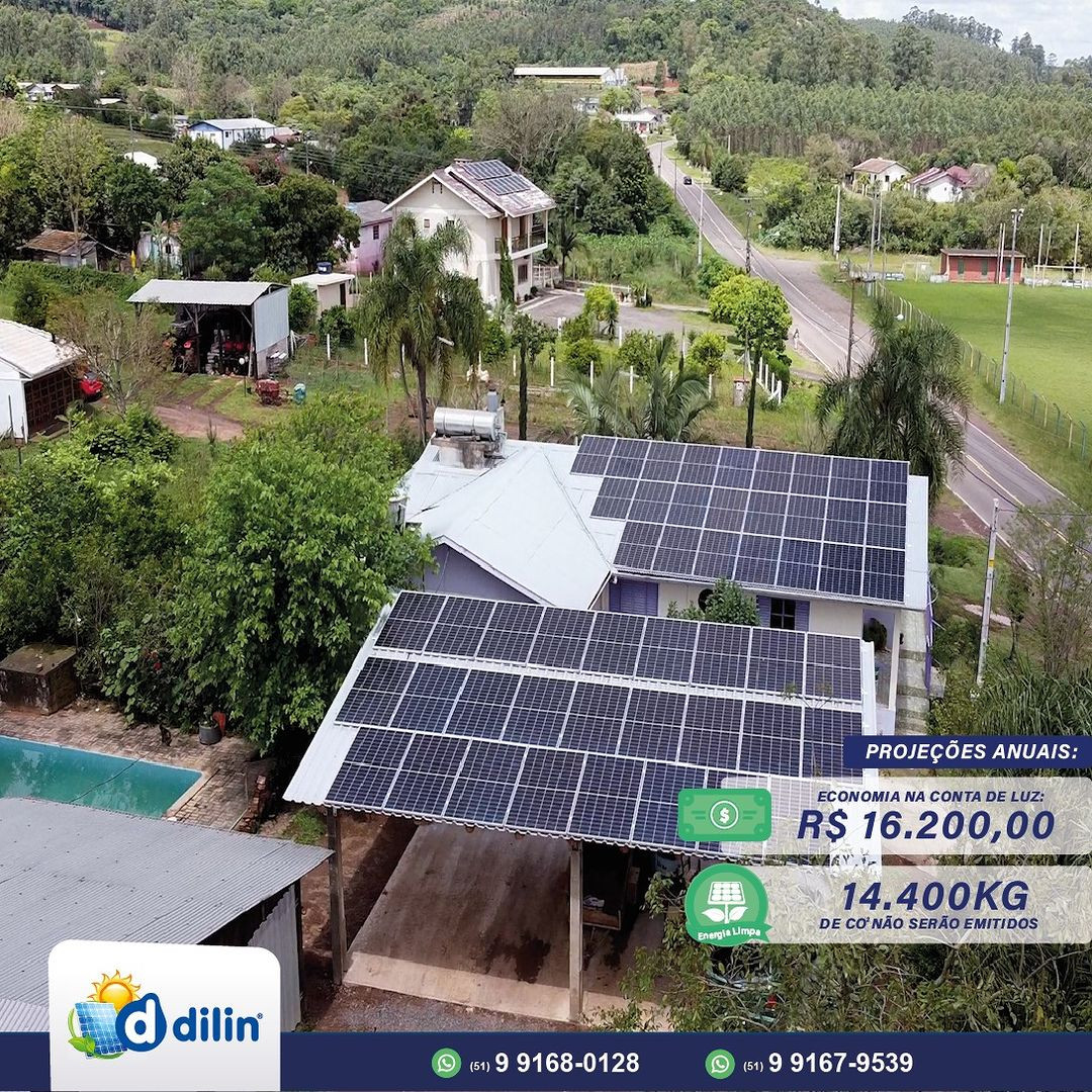 Na foto de destaque da matéria, o cliente da Dilin Solar, Nairton Ruff Costa, do bairro Morro Bonito, em Paverama, instalou 50 painéis de 460w, que irão gerar, de acordo com a projeção, uma economia de R$ 16.200,00 na conta de luz, além de evitar a emissão anual de 14.400 de CO² na natureza.