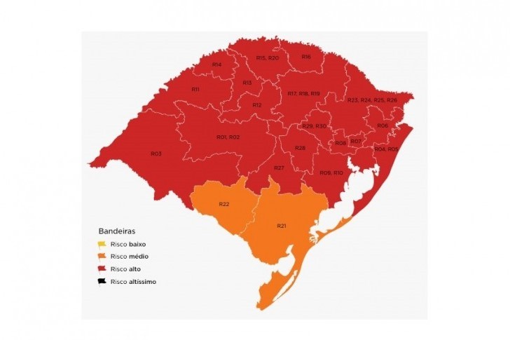 Nesta semana, o Estado havia ficado dividido: 10 regiões em vermelho e 10 em laranja. Na nova rodada, apenas a região de Pelotas apresentou melhora nos indicadores suficiente para ter regressão na bandeira, passando de vermelha para a laranja. Bagé foi a única que permaneceu no mesmo nível, com cor laranja.