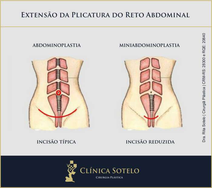Uma miniabdominoplastia limita-se à remoção da pele, mas pode, se necessário, ser associada à lipoaspiração para eliminar gordura localizada. Dependendo das suas necessidades, a miniabdominoplastia também faz o reajuste, na parte inferior dos músculos reto-abdominais afrouxados e propicia a remoção de boa parte das estrias localizadas abaixo do umbigo.