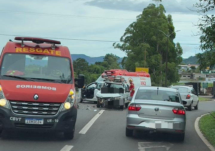 Colisão envolveu dois veículos na manhã deste sábado e mobilizou Bombeiros Voluntários e Samu.