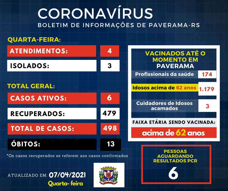 Atualmente o município tem 6 casos ativos, sendo que 479 já estão recuperados e 13 óbitos em decorrência do novo Coronavírus.