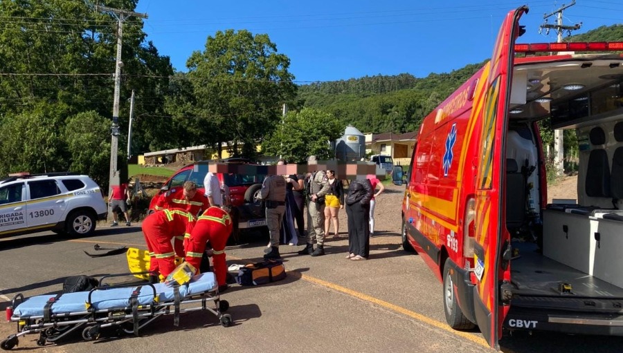 Já o condutor da motocicleta Honda CG, de cor azul, com placas de Nova Bréscia, um homem de 25 anos, natural daquele município, apresentava ferimentos moderados. Ele recebeu atendimento no local e foi encaminhado ao Hospital Ouro Branco pela equipe dos Bombeiros Voluntários de Teutônia. O caroneiro da motocicleta recusou atendimento médico no local.