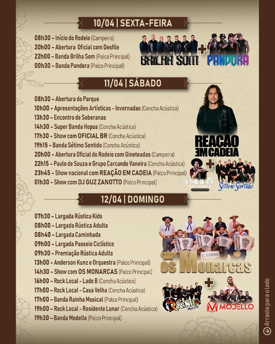 Entre os destaques da programação estão o rodeio crioulo, apresentações musicais, exposição de animais, feira da agricultura familiar, estandes da indústria e comércio, artesanato, parque de diversões e atividades voltadas para todas as idades.