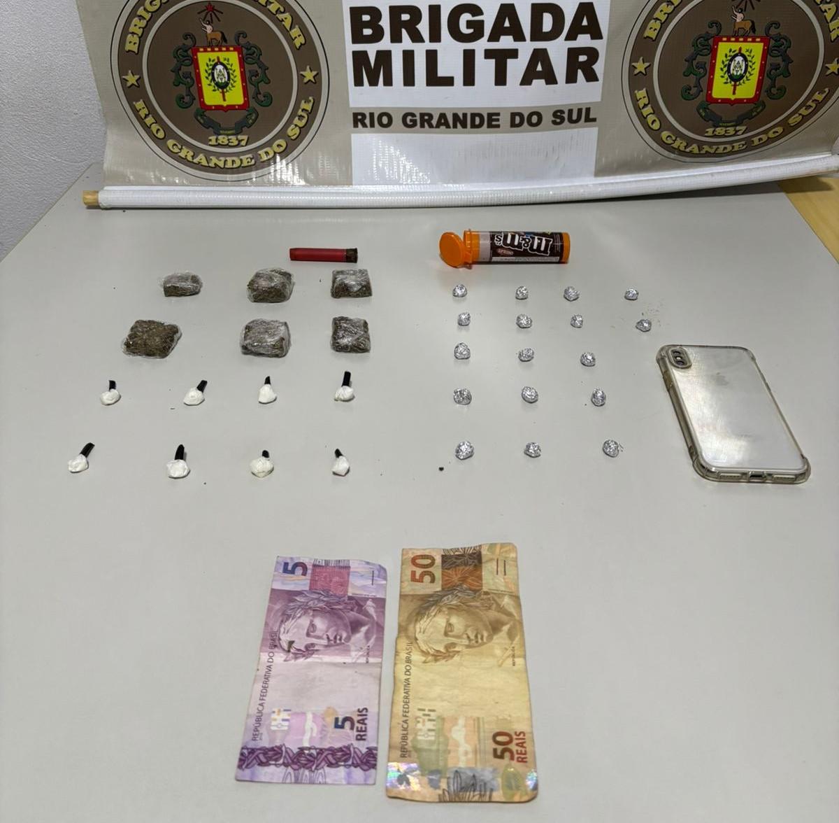 Durante a ação, foram apreendidas porções de crack, cocaína e maconha, além de R$ 55,00 em dinheiro, um telefone celular e o veículo utilizado.