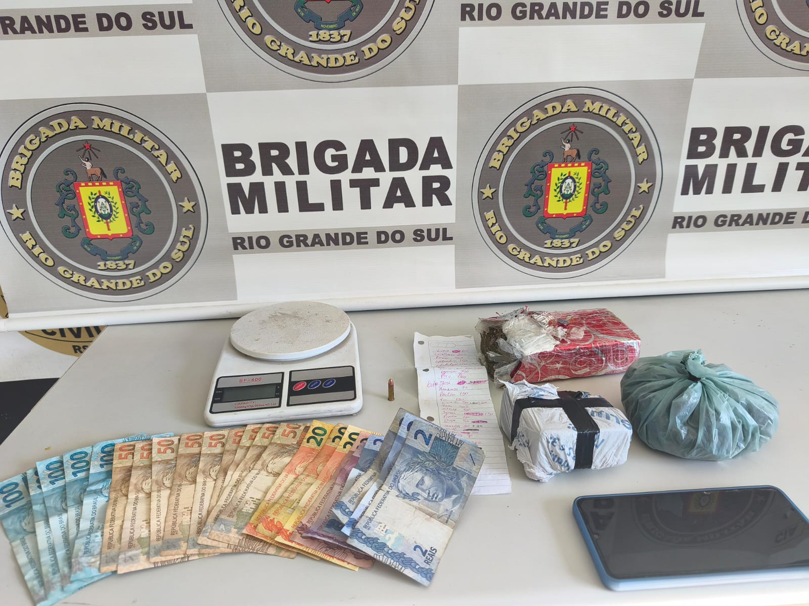 Os suspeitos, de 29 e 25 anos, foram abordados durante uma operação de combate ao tráfico de entorpecentes. Com eles, os policiais apreenderam 787 gramas de maconha, uma balança de precisão, dinheiro em espécie, uma munição de calibre .22, um telefone celular e anotações relacionadas à comercialização de drogas.