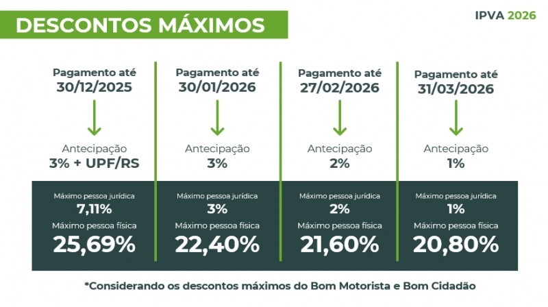 Quem quitar o IPVA até 30 de dezembro terá desconto direto de 3% e evitará a atualização da UPF/RS, estimada em 4,43%, o que representa uma redução potencial de 7,43%. O abatimento pode ser ainda maior com a soma dos programas Bom Motorista e Bom Cidadão. Para motoristas com todos os benefícios acumulados, o desconto máximo chega a 25,69%. Cerca de 900 mil veículos – o equivalente a 22% da frota tributável – podem atingir esse percentual pagando o tributo em dezembro.