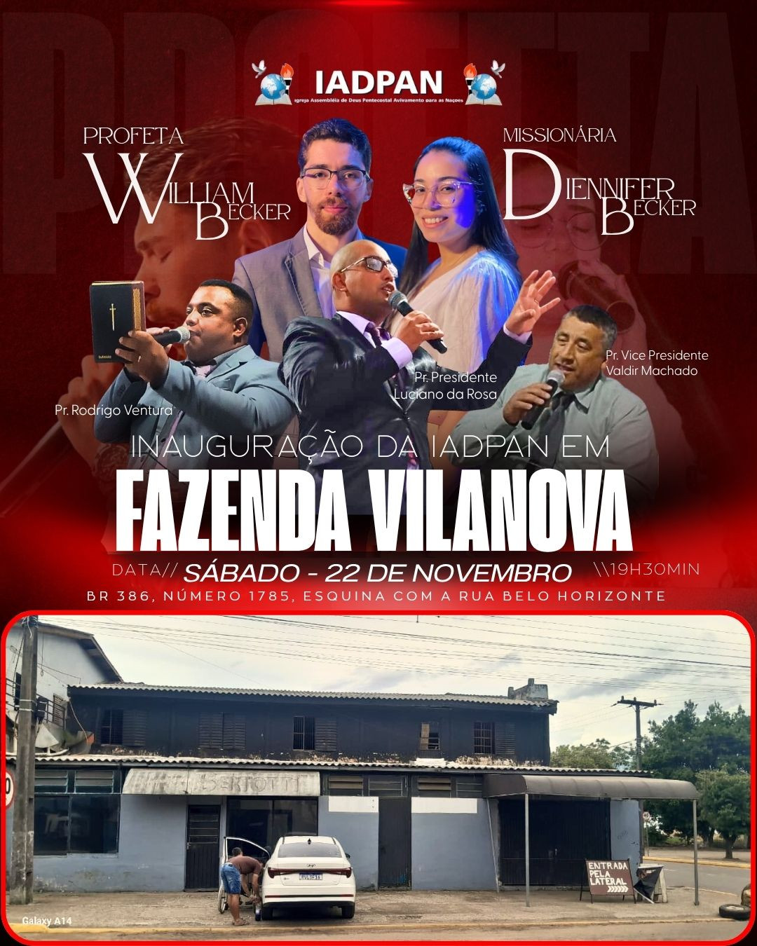 A Igreja Assembleia de Deus Pentecostal Avivamento para as Nações (Iadpan) reinaugura neste sábado, dia 22, sua congregação em Fazenda Vilanova. O novo espaço está localizado às margens da BR-386, número 1785, ao lado da rodoviária, no antigo Salão do Osvaldo.