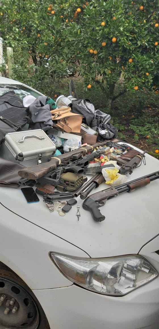 Com eles foram encontrados três fuzis, três espingardas calibre 12, uma pistola, munições dos calibres 556 e 12, roupas da Polícia Civil, miguelitos, ao menos seis rádios HT, além de uma grande quantia em dinheiro. Um veículo Corolla clonado e um Kadett foram recolhidos.