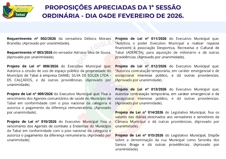 A Câmara de Vereadores de Tabaí realizou, na última quarta-feira, dia 4, às 19h, a primeira sessão ordinária de 2026, marcando o início oficial dos trabalhos legislativos do ano.