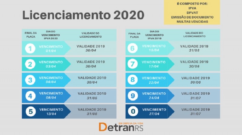 O calendário de licenciamento de veículos do DetranRS para 2020 começa a vencer em abril e os prazos terminam em julho, conforme o dígito final da placa.