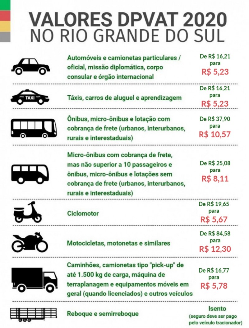 A previsão é de que na segunda-feira, dia 13 de janeiro de 2020, a tabela corrigida do Dpvat já esteja disponível para pagamento na rede bancária conveniada (Banrisul, Banco do Brasil - para correntistas, Sicredi, Bradesco, Santander e lotéricas da Caixa).