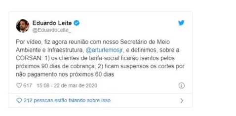O governador Eduardo Leite afirmou, em sua conta no Twitter, na tarde deste domingo, 22, que estão suspensos por 60 dias os cortes de água por falta de pagamento no âmbito da Corsan. A segunda informa que os clientes da tarifa social ficarão isentos de cobrança pelos próximos 90 dias.