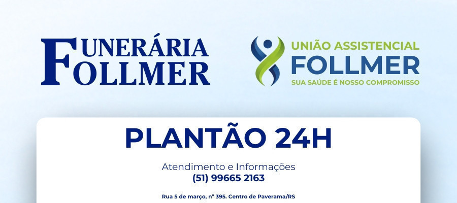 Nota fúnebre da Funerária Follmer e Plano União Assistencial. Rua 5 de Março, nº 395. Fone: (51) 3761-1054 | Plantão: (51) 9 9665-2163.